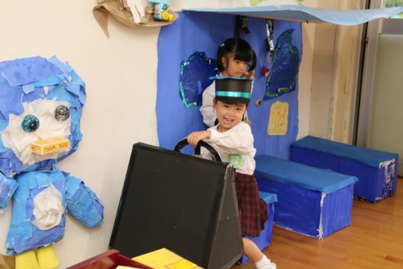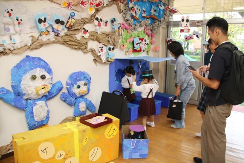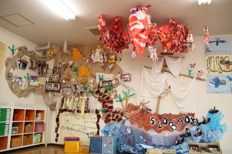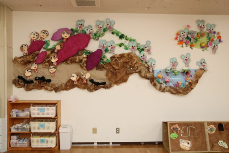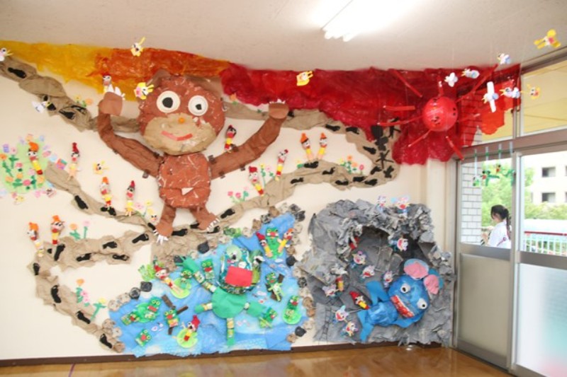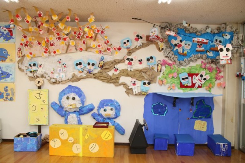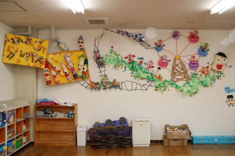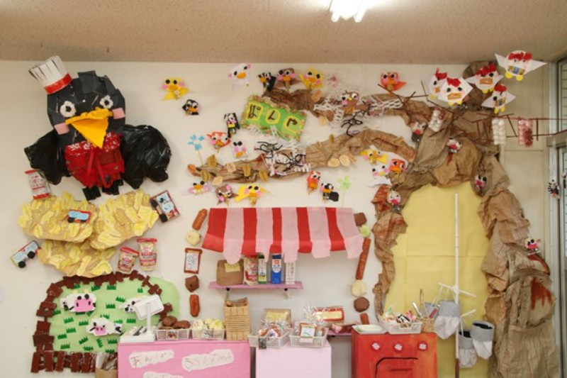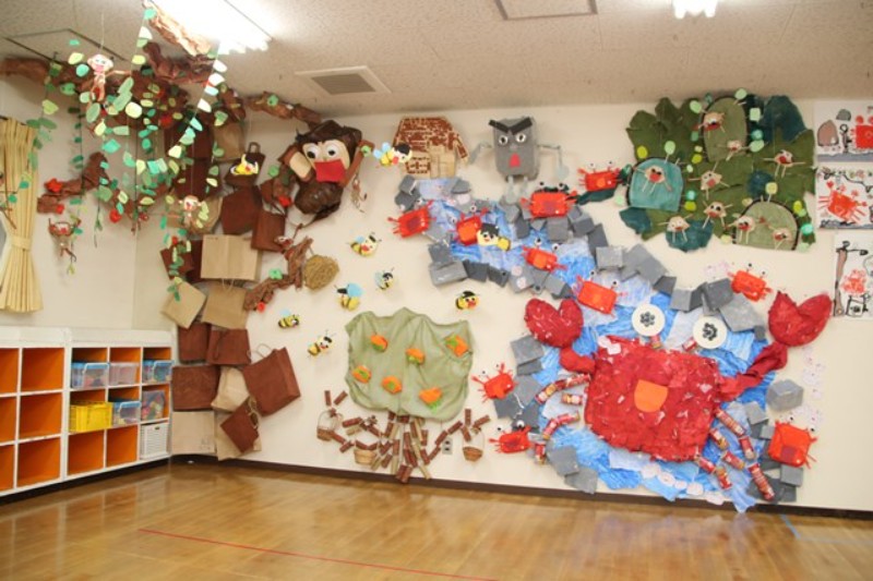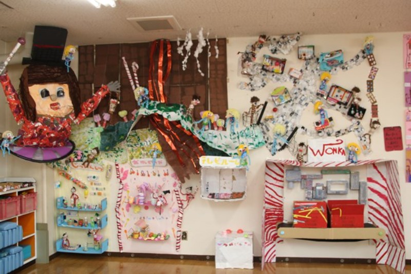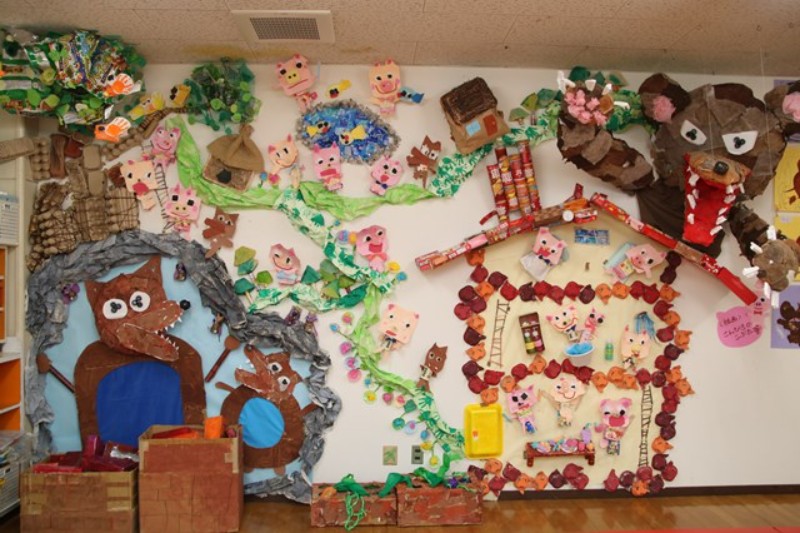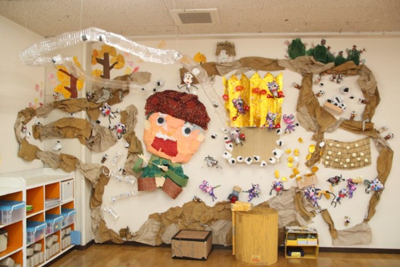のびのび造形展を行いました。ご家庭から提供していただいた廃材等が、新しい姿となり壁面に見事に装飾されています。自分たちの壁面制作を紹介するかわいいCMダンスをはじめ、お部屋いっぱいのお話の世界を、お楽しみください♪