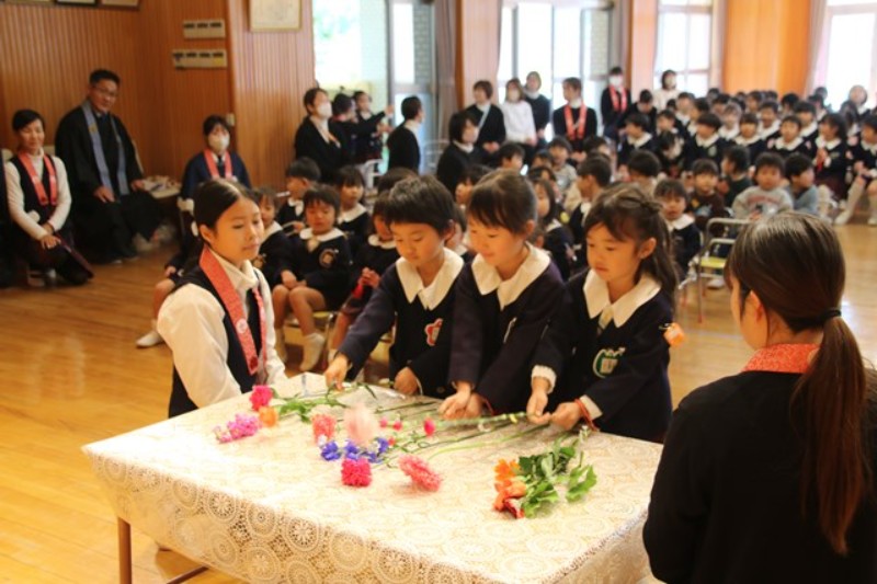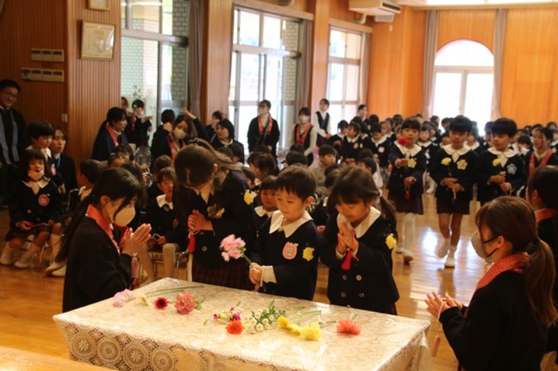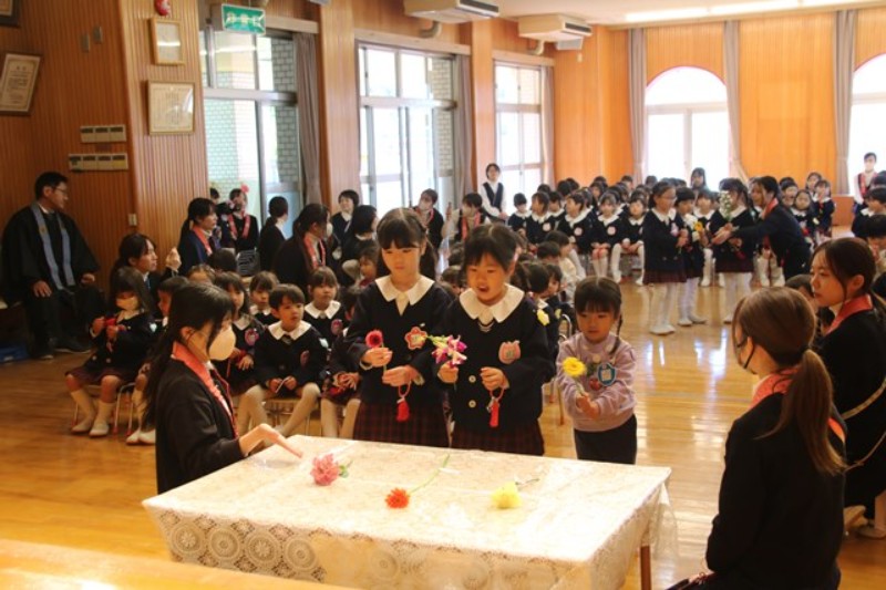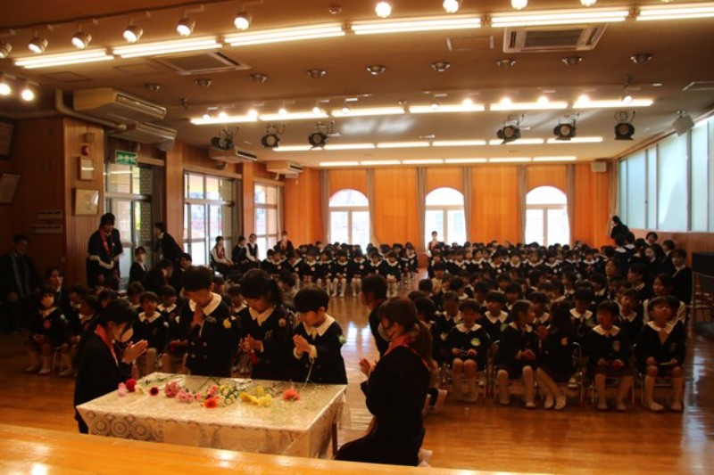 2学期の終業式を行いました。はじめに献花をもったお友だちが入場し、仏参を行いました。先生からは2学期にみんなが頑張った行事を振り返ったお話がありました。